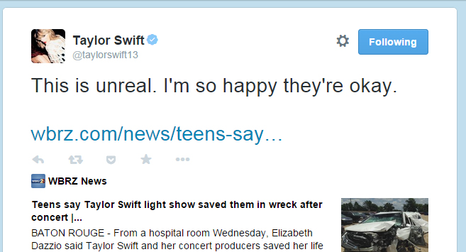 Se havia ainda alguma dúvida de que Taylor Swift é a rainha do mundo, agora já não há. A história éimpressionante. Um grupo de adolescentes que sofreu um acidente de carro, logo após sair do show da Taylor, utilizou as pulseiras iluminadas que haviam ganhado no concerto para chamar a atenção de outros motoristas.